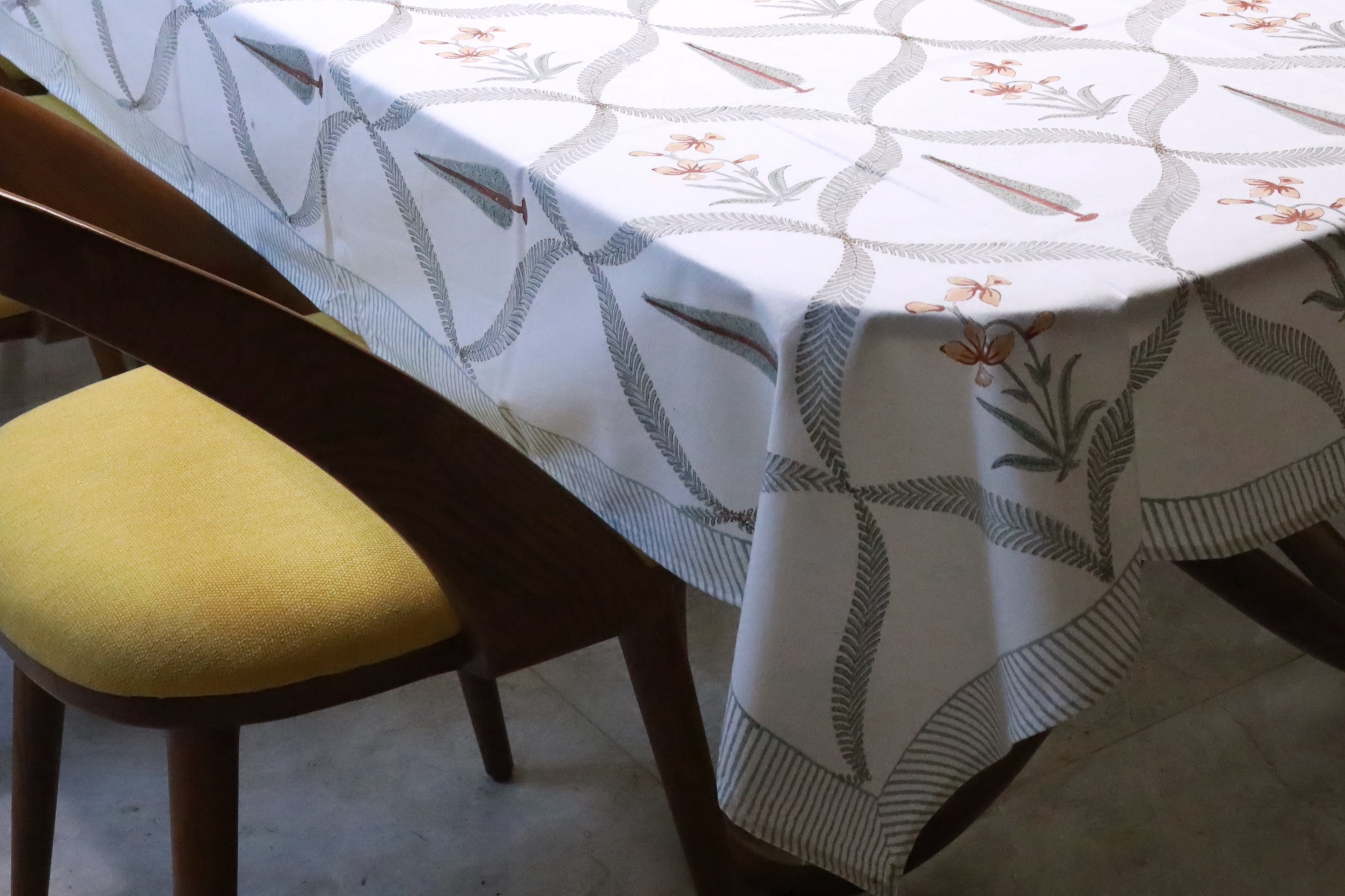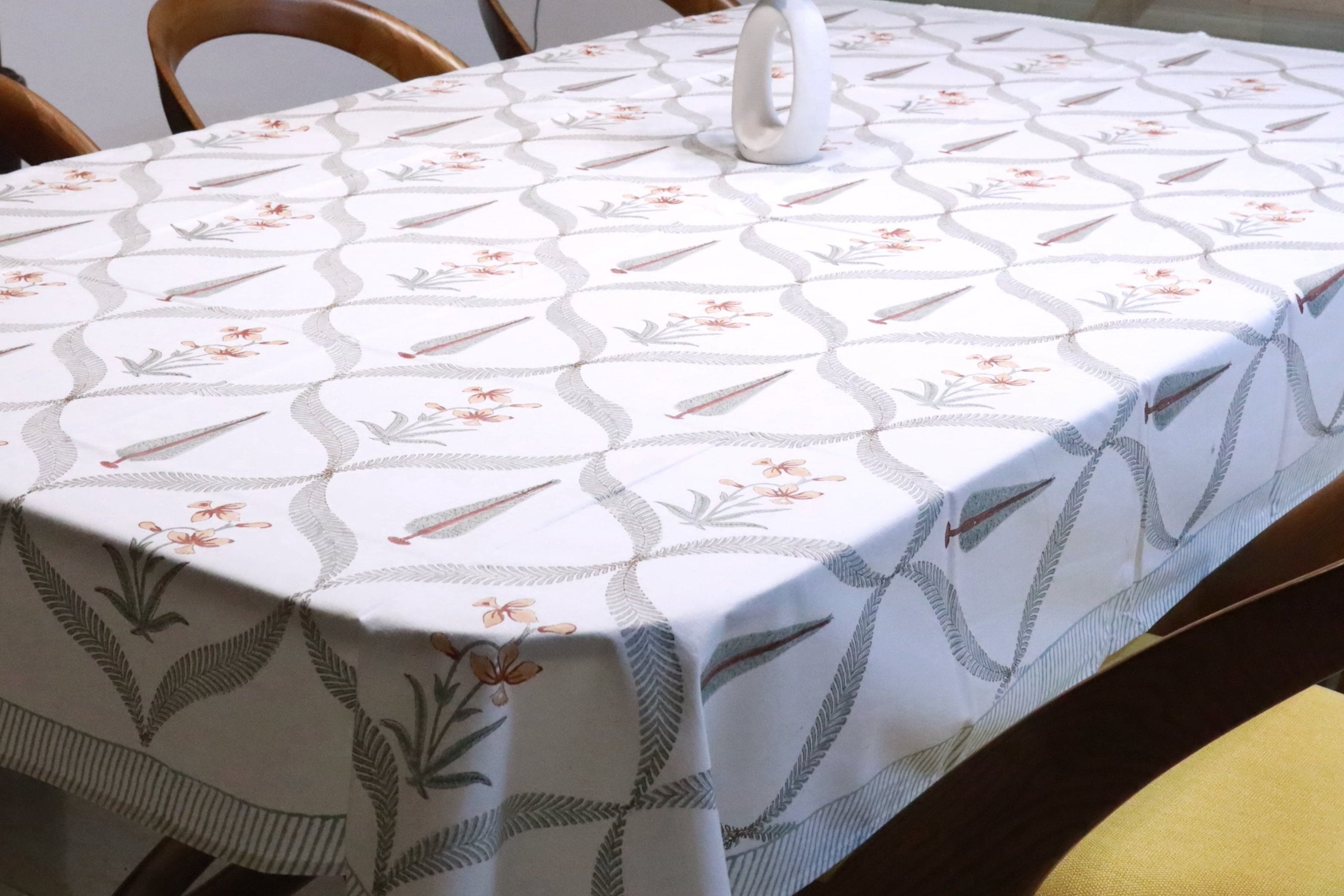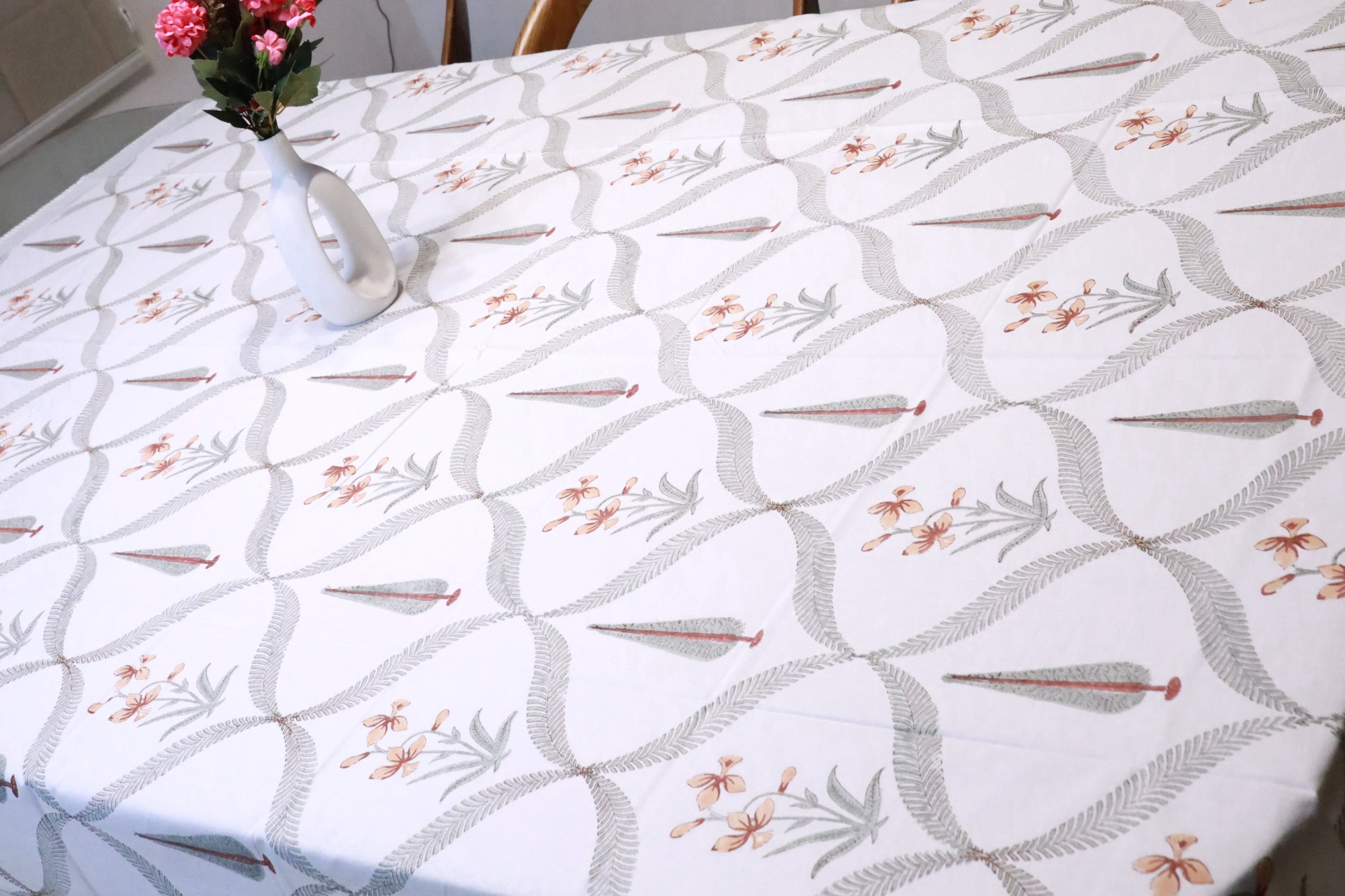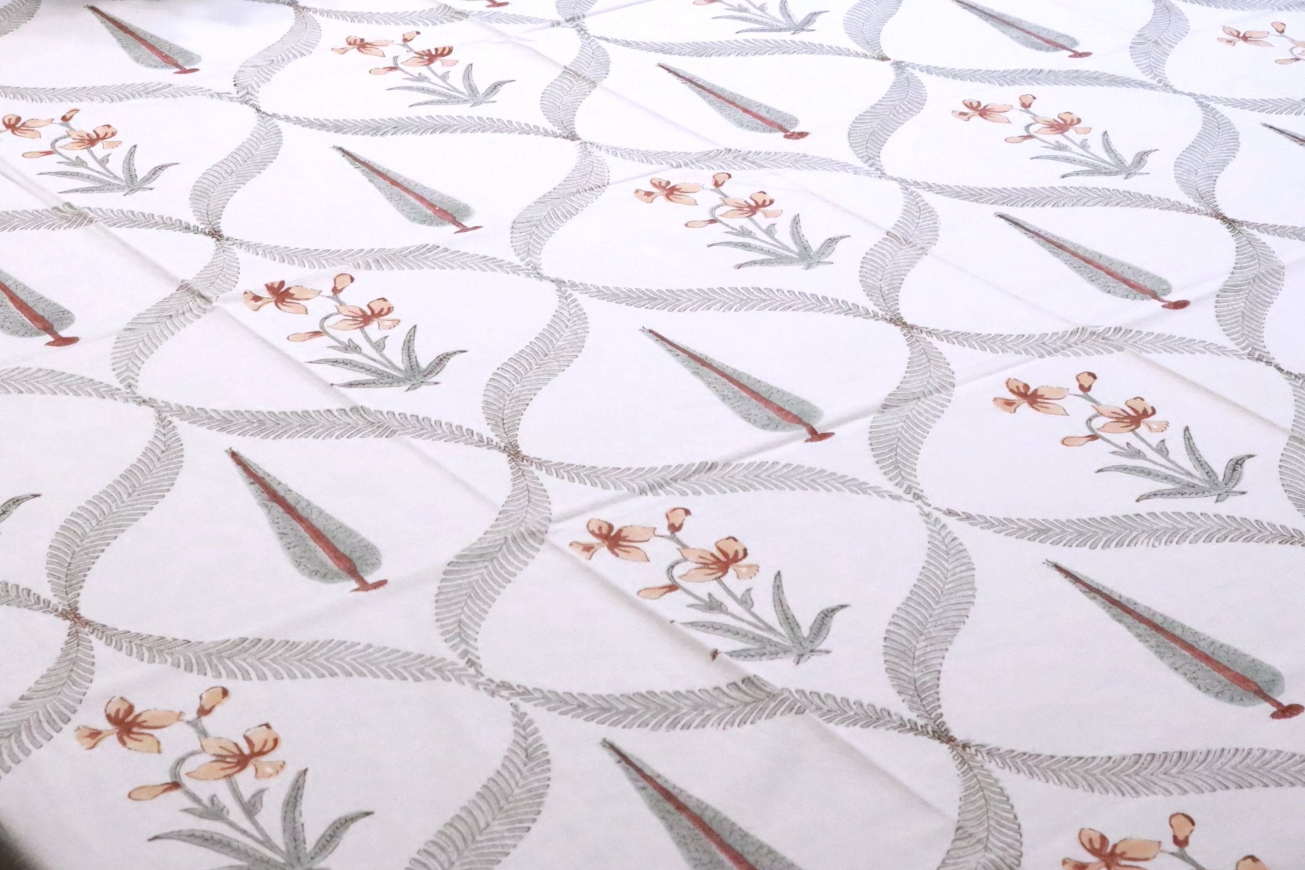 Introducing our beautiful grey and peach pine block print tablecloth, where traditional craftsmanship meets modern elegance. The elegant interplay of cool grey and gentle peach creates a serene atmosphere, reminiscent of a tranquil forest at dawn. Delicate pine motifs add a touch of rustic charm, making this design perfect for both modern and cozy spaces.